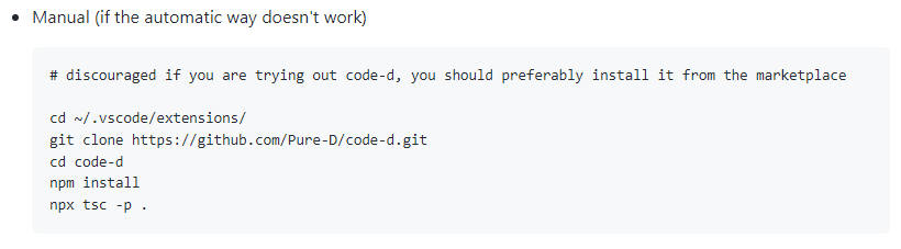 手動での code-d のインストール方法としてこう書かれているが、実際に拡張機能をインストールして動かすまでにはまだ作業が必要なようだった。